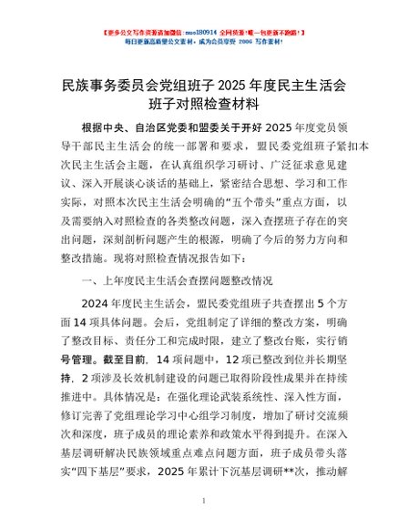 / 民族事务委员会党组班子2025年度民主生活会班子对照检查材料