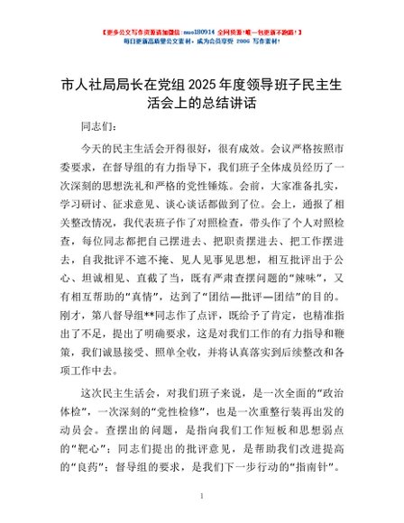 / 市人社局局长在党组2025年度领导班子民主生活会上的总结讲话