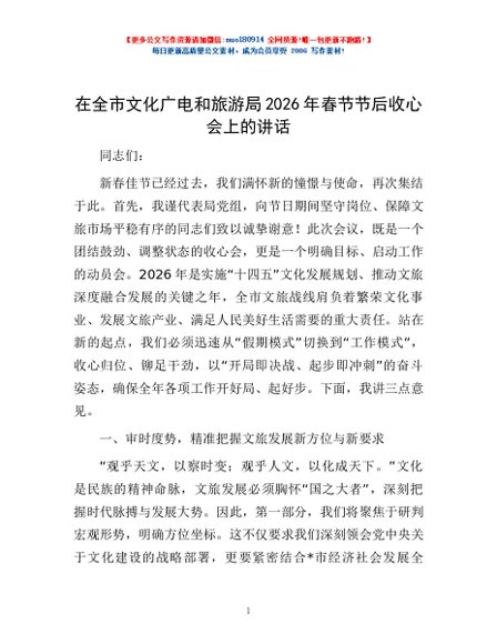 / 在全市文化广电和旅游局2026年春节节后收心会上的讲话