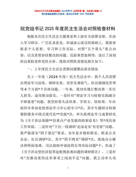 / 院党组书记2025年度民主生活会对照检查材料