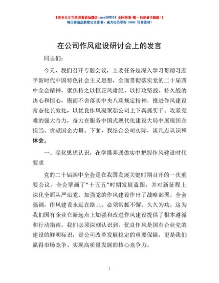 / 在公司作风建设研讨会上的发言