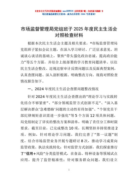 / 市场监督管理局党组班子2025年度民主生活会对照检查材料