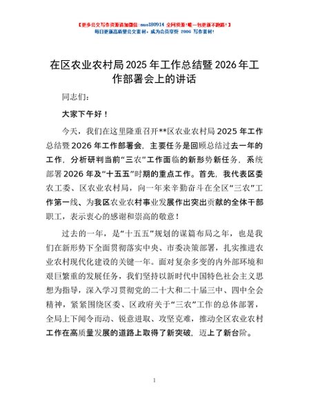 / 在区农业农村局2025年工作总结暨2026年工作部署会上的讲话