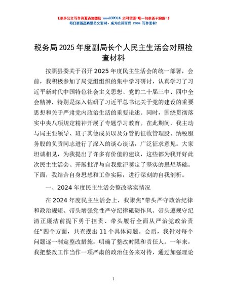 / 税务局2025年度副局长个人民主生活会对照检查材料