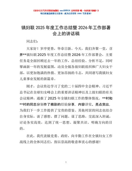 / 镇妇联2025年度工作总结暨2026年工作部署会上的讲话稿