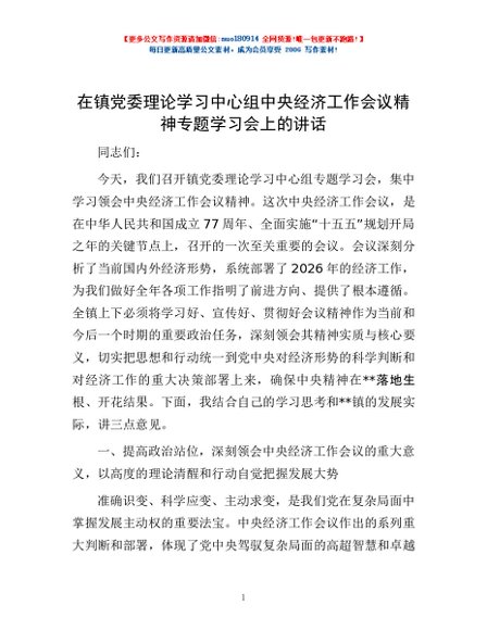 在镇党委理论学习中心组2026年第1次集中学习研讨会上的讲话