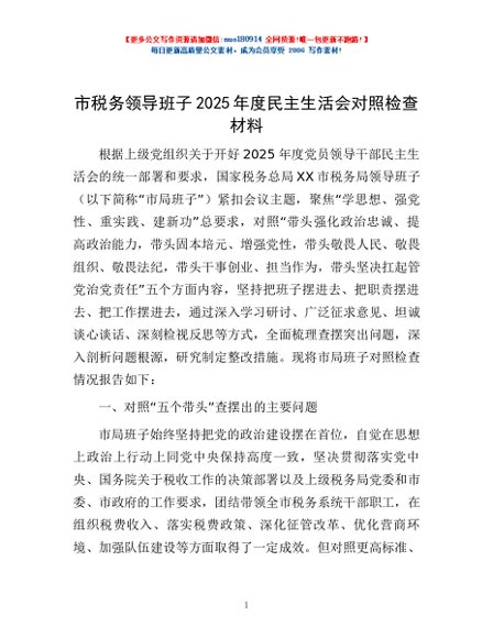 / 市税务领导班子2025年度民主生活会对照检查材料
