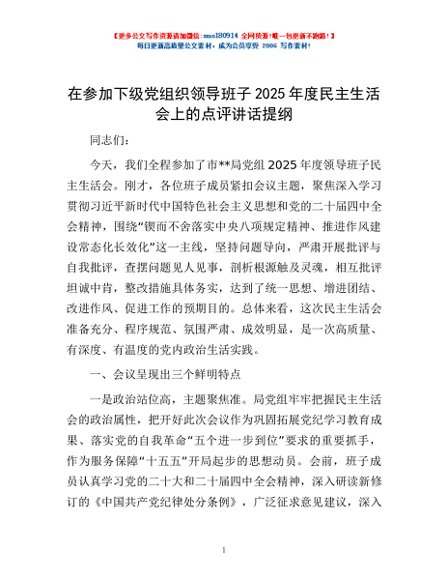 / 在参加下级党组织领导班子2025年度民主生活会上的点评讲话提纲