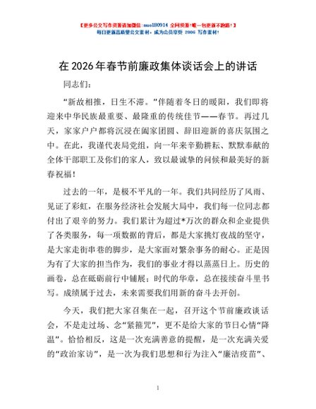 / 在2026年春节前廉政集体谈话会上的讲话