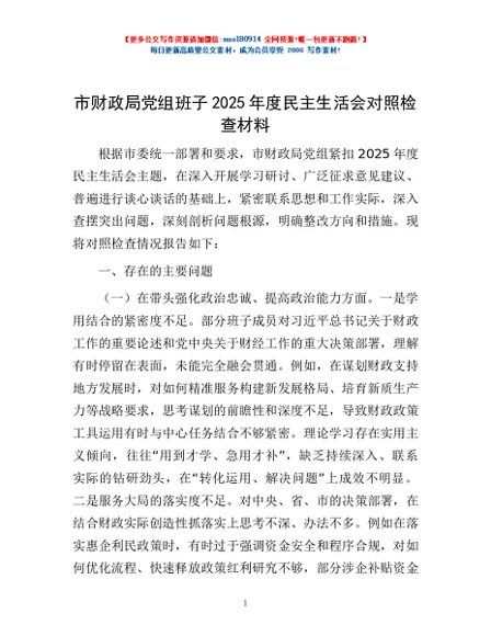 / 市财政局党组班子2025年度民主生活会对照检查材料
