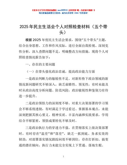 / 2025年民主生活会个人对照检查材料(五个带头)