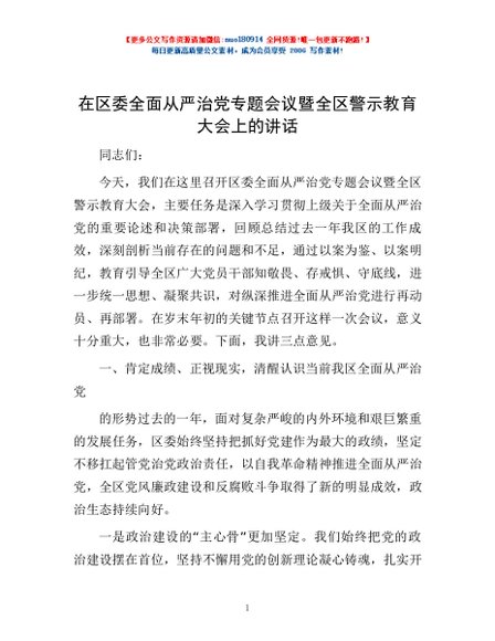 / 在区委全面从严治党专题会议暨全区警示教育大会上的讲话
