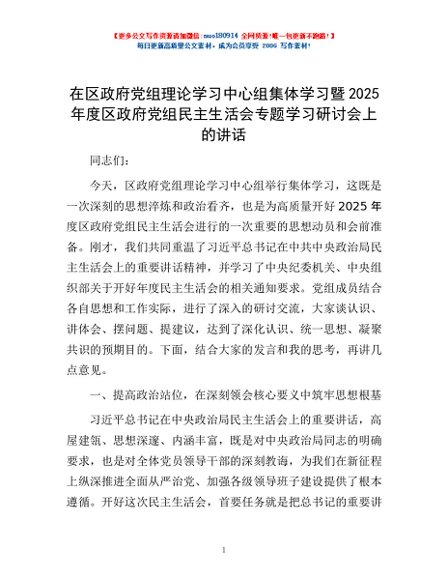 / 在区政府党组理论学习中心组集体学习暨2025年度区政府党组民主生活会专题学习研讨会上的讲话