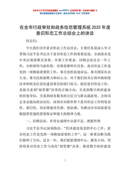 / 在全市行政审批和政务信息管理系统2025年度意识形态工作总结会上的讲话