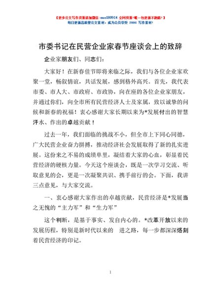 / 市委书记在民营企业家春节座谈会上的致辞