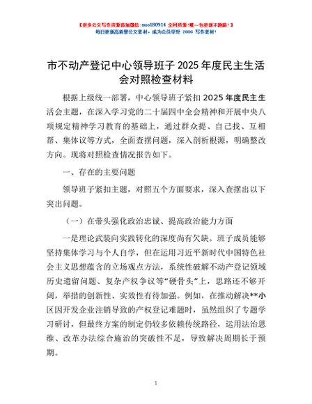 / 市不动产登记中心领导班子2025年度民主生活会对照检查材料