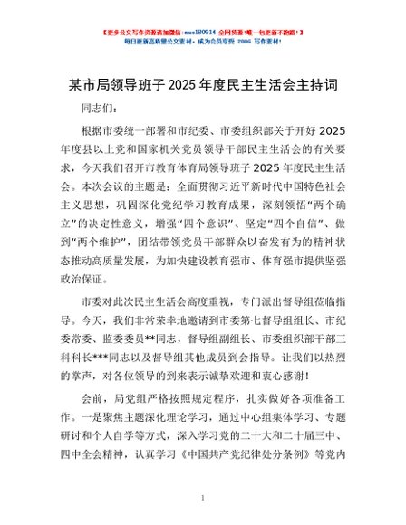 在市委老干部局领导班子2025年度民主生活会上的主持词