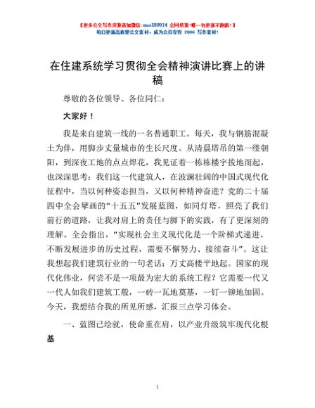 / 在住建系统学习贯彻全会精神演讲比赛上的讲稿