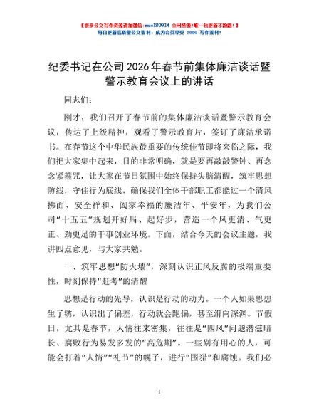 / 纪委书记在公司2026年春节前集体廉洁谈话暨警示教育会议上的讲话