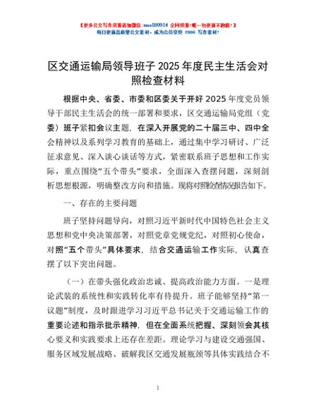 / 区交通运输局领导班子2025年度民主生活会对照检查材料