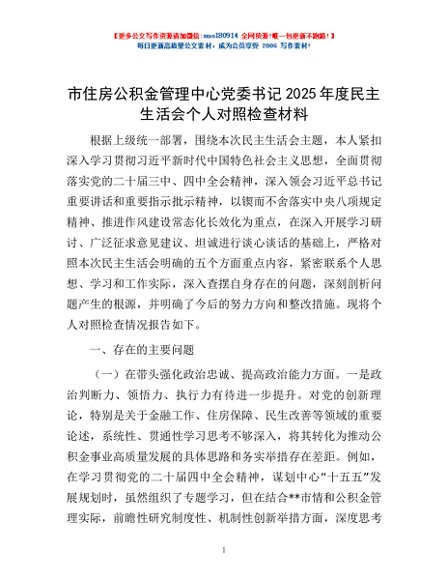 / 市住房公积金管理中心党委书记2025年度民主生活会个人对照检查材料