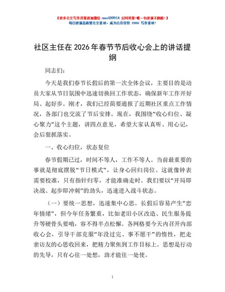 / 社区主任在2026年春节节后收心会上的讲话提纲