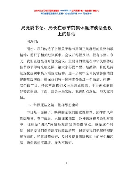 / 局党委书记、局长在春节前集体廉洁谈话会议上的讲话
