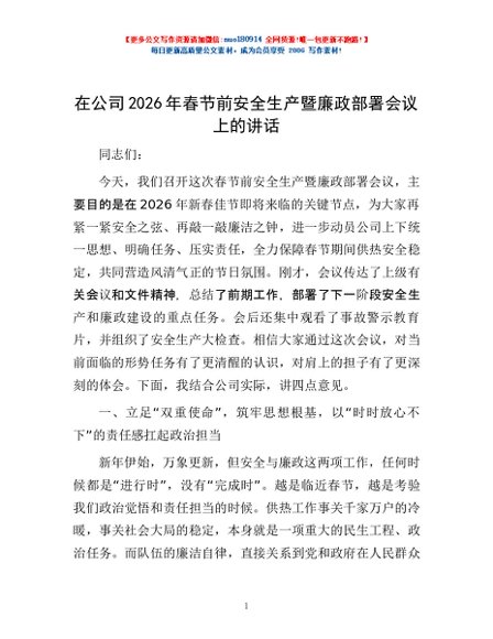 / 在公司2026年春节前安全生产暨廉政部署会议上的讲话