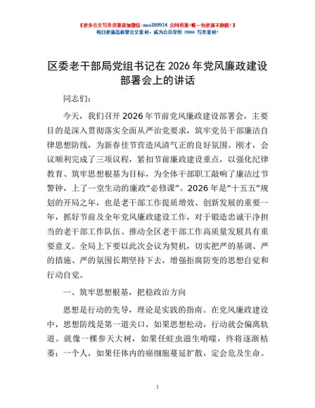 / 区委老干部局党组书记在2026年党风廉政建设部署会上的讲话