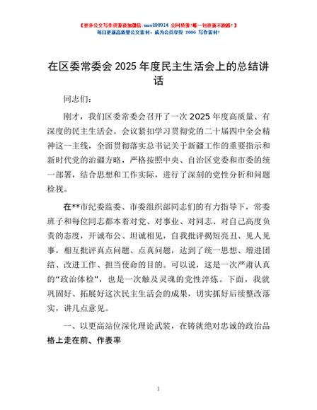 / 在区委常委会2025年度民主生活会上的总结讲话