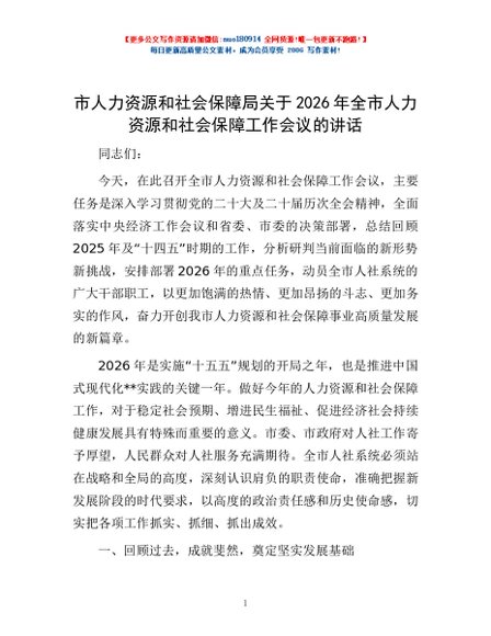 / 市人力资源和社会保障局关于2026年全市人力资源和社会保障工作会议的讲话