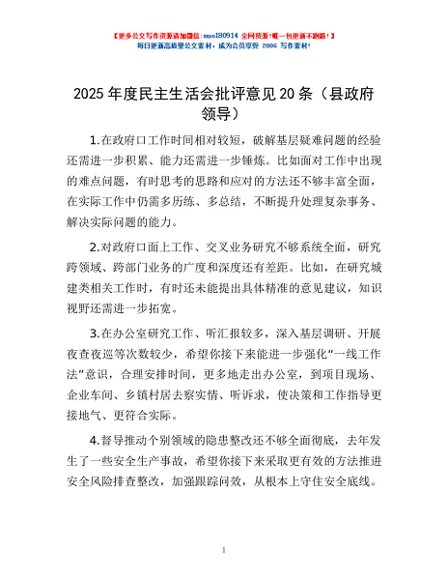 / 2025年度民主生活会批评意见20条(县政府领导)
