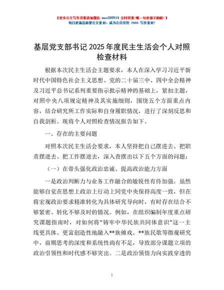 / 基层党支部书记2025年度民主生活会个人对照检查材料