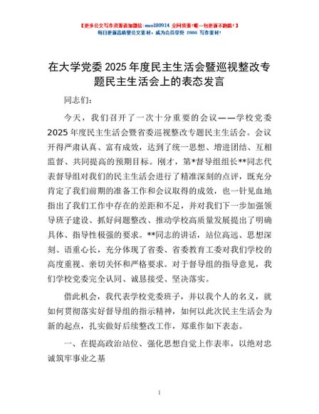 / 在大学党委2025年度民主生活会暨巡视整改专题民主生活会上的表态发言