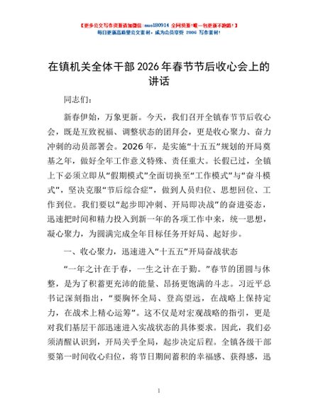 / 在镇机关全体干部2026年春节节后收心会上的讲话