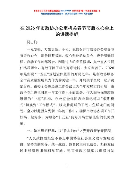 / 在2026年市政协办公室机关春节节后收心会上的讲话提纲