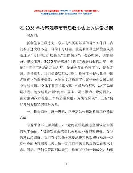 / 在2026年检察院春节节后收心会上的讲话提纲
