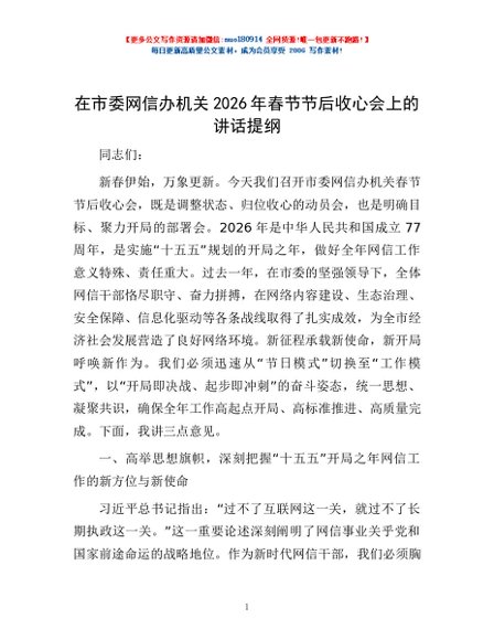 / 在市委网信办机关2026年春节节后收心会上的讲话提纲