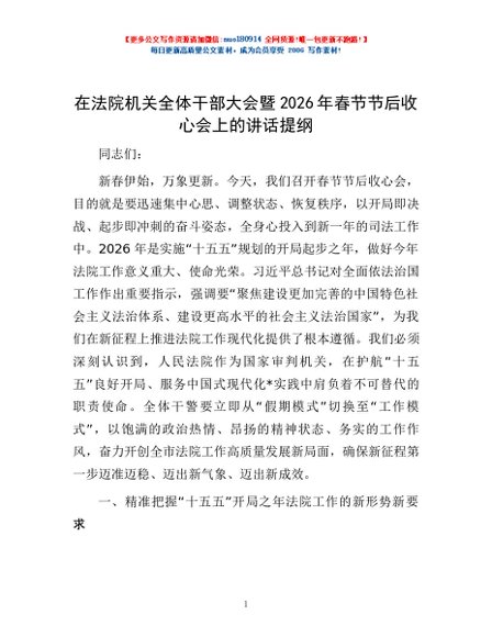 / 在法院机关全体干部大会暨2026年春节节后收心会上的讲话提纲