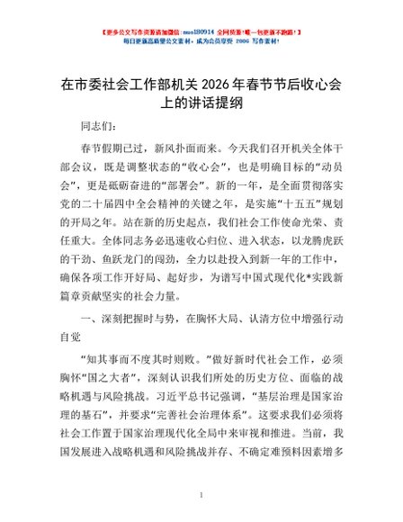 / 在市委社会工作部机关2026年春节节后收心会上的讲话提纲