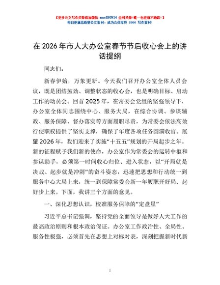 / 在2026年市人大办公室春节节后收心会上的讲话提纲