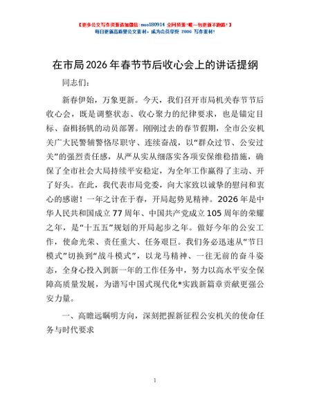 / 在市局2026年春节节后收心会上的讲话提纲
