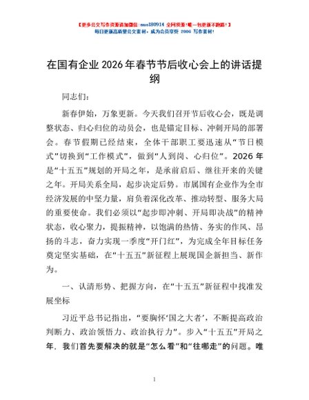 / 在国有企业2026年春节节后收心会上的讲话提纲