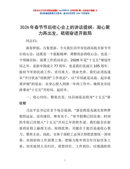 / 2026年春节节后收心会上的讲话提纲:凝心聚力再出发,砥砺奋进开新局