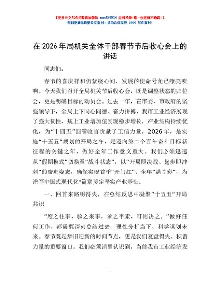 / 在2026年局机关全体干部春节节后收心会上的讲话