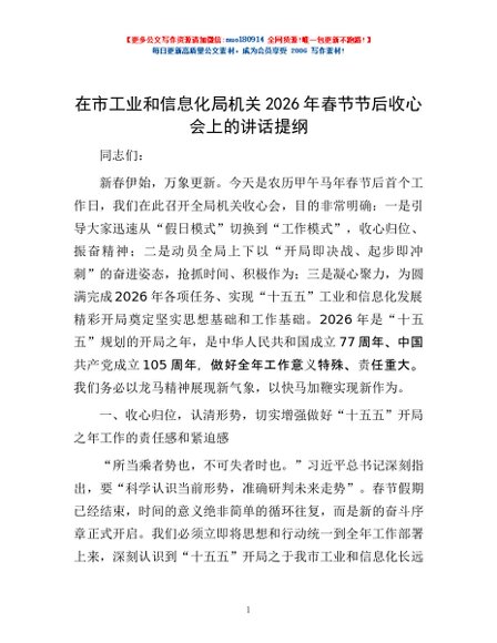 / 在市工业和信息化局机关2026年春节节后收心会上的讲话提纲