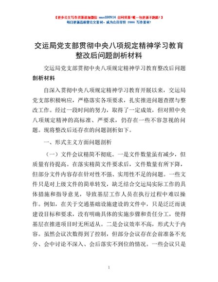 / 交运局党支部贯彻中央八项规定精神学习教育整改后问题剖析材料