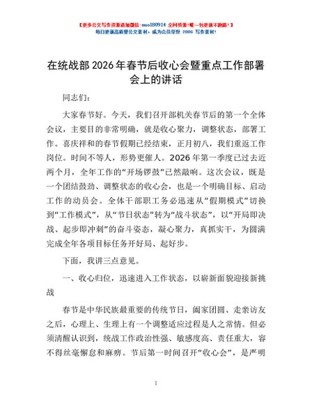 / 在统战部2026年春节后收心会暨重点工作部署会上的讲话