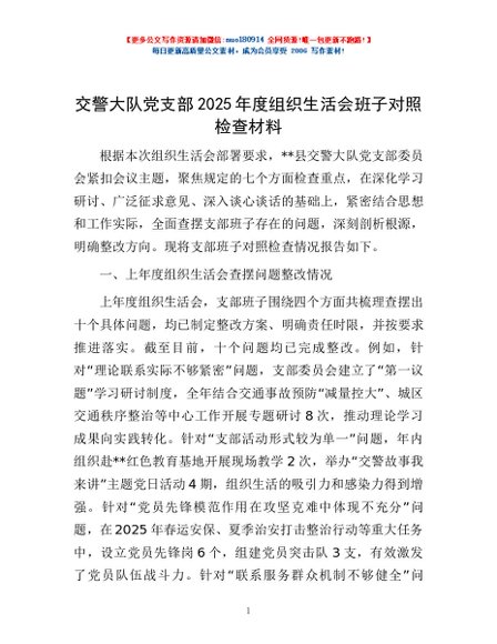 / 交警大队党支部2025年度组织生活会班子对照检查材料