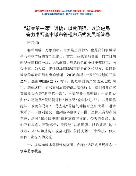 / “新春第一课”讲稿:以质图强、以治破局,奋力书写全市城市管理内涵式发展新答卷